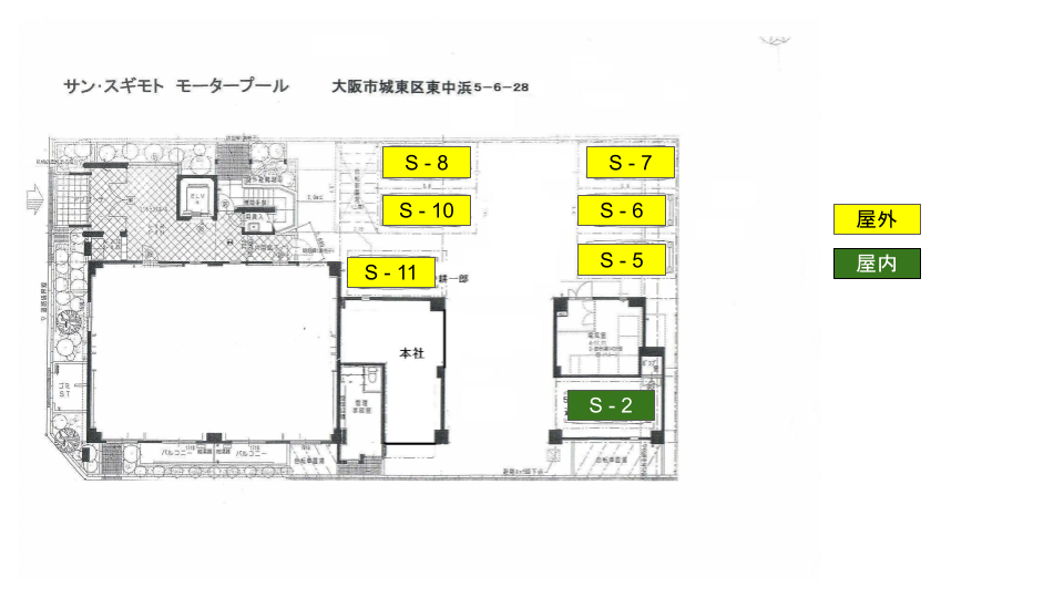 クリックすると建物と駐車場の見取り図が表示されます。番号は旧番号(建物毎に1番から振られた番号)で記載されています。Uスギモト